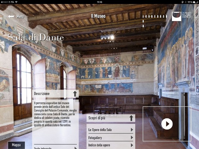 Si tratta di uno strumento dinamico, affascinante, coinvolgente che rende ancora più piacevole la scoperta di questo straordinario scrigno di opere d’arte e di architettura, aggiungendo all’esperienza culturale una componente ludica, elemento sempre più importante per coinvolgere anche i “nativi digitali” nella scoperta del patrimonio museale. Visitare le meraviglie del Palazzo Comunale, muoversi tra le sale della Pinacoteca e la Torre Grossa accompagnati dalle parole di esperti – del calibro di Alessandro Bagnoli, Roberto Bartaliani, Franco Cardini, Massimo Gavazzi, Michele Maccherini, Antonello Mennucci - e da due mappe interattive che permetteranno di collocare la nostra visita virtuale nello spazio “reale” del museo, mentre ammiriamo nei minimi dettagli di ogni opera. L’applicazione per iPhone e iPad fa vivere un “tour personalizzato” sulle singole esigenze: è possibile attraversare le diverse sale ed aumentare via via il grado di approfondimento dei contenuti; trentaquattro zoom permettono di osservare altrettante opere, anche quelle meno visibili per dimensioni e distanza, grazie a foto ad alta risoluzione; sette contributi audio-video offrono approfondimenti multidisciplinari appositamente realizzati per l’occasione, regalando così un vero e proprio viaggio nel tempo tra i segreti di un passato più che mai presente e completamente accessibile.