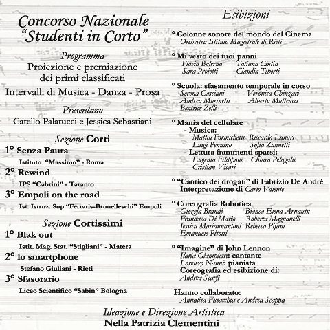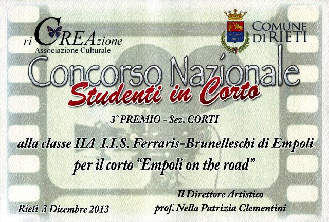 Un altro importante successo per l'I.I.S Ferraris-Brunelleschi di Empoli, che con il cortometraggio “Empoli on the road”, realizzato dagli alunni della classe II A informatica, con i docenti Marco Dolfi e Cristina Nesi all’interno del progetto “Dentro lo schermo” durante la premiazione, svoltasi al Teatro Flavio Vespasiano di Rieti, martedì 3 dicembre, ha ricevuto il Terzo premio al concorso nazionale “Studenti in corto”.