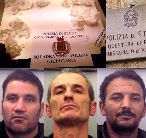 Arrestati tre uomini, un italiano di Volterra e due nordafricani, ritenuti dal commissariato di Polizia della città etrusca spacciatori del mercato locale.