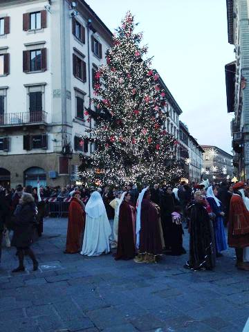 Dopo la partenza da Piazza Pitti, il corteo è arrivato in piazza Duomo per il saluto dei figuranti e lo scoppio della colubrina. I Re Magi hanno deposto i loro doni ai piedi del Presepe vivente.