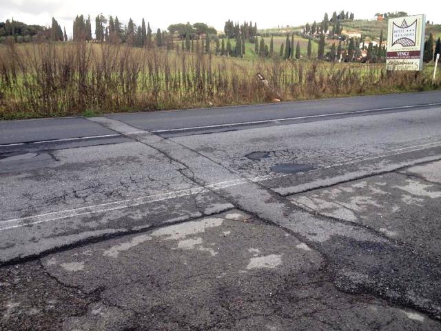 Davvero in pessime condizioni l'asfalto lungo la strada provinciale 9 del Montalbano, nel territorio comunale di Vinci, nel tratto tra Sovigliana e Petroio. Nelle ultime settimane il manto della trafficata arteria che collega la popolosa frazione, ma soprattutto Empoli, con Vinci, Cerreto Guidi e Fucecchio, si è ulteriormente deteriorato fino a raggiungere i livelli facilmente visibili nelle immagini.