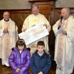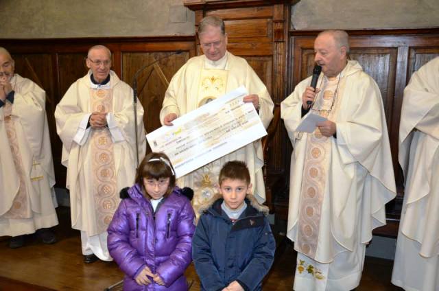 La prima trance di 3000 euro è stata consegnata ieri al al responsabile della Caritas Diocesana, S.E. Mons. Fausto Tardelli in persona, che come ogni mese ha guidato in pellegrinaggio oltre 200 persone, fino al Santuario  della Madonna dei Bambini. E proprio al termine della solenne celebrazione dedicata alla Santa Vergine di  Cigoli, sulle note del nuovo inno composto da Carlo Fermalvento, Don Giampiero Taddei, con l’aiuto delle due piccole mascottes del presepe, Martina e Matteo Macchi,  ha consegnato  nelle mani del vescovo l’assegno destinato al centro di accoglienza di Santa Croce sull’Arno.