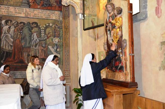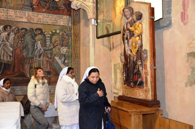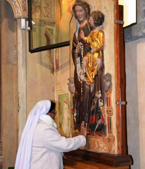 «Nel periodo di apertura del presepe - spiega il dottor Andrea Ferreri, coordinatore del Gruppo dei Giovani Presepisti - sono stati raccolti 6150 euro dalle iniziative collaterali come il “mercatino di solidarietà” e la vendita di caldarroste.  Di questi, 3000  sono stati devoluti al progetto promosso dalla diocesi di San Miniato “Avvento di carità” che per  questo anno è destinato a finanziare il centro di accoglienza gestito dalla cooperativa della Caritas, “La querce di Mamre”.”Gli ulteriori 3150-prosegue Don Giampiero Taddei saranno destinati al proseguimento del progetto “Sophia” per consentire ai bambini indigenti del villaggio di Mallapally nello stato del Kerala, in India, di vivere e studiare, e tengo a precisare che saranno consegnati direttamente nelle mani del responsabile,  Mons. Antony kollamparampil, senza intermediari, nel mese di Marzo” . Alla fine sono sfilati  sotto la sacra immagine della Madonna i membri del gruppo Giovani  Presepisti  che hanno collaborato alla realizzazione del Presepe e alle iniziative di carità, per la foto di rito con il Vescovo e per la vera standing ovation che i pellegrini hanno loro riservato dopo le parole di ringraziamento del Vescovo e del Vicario Don Morelli Morello.
