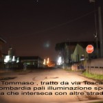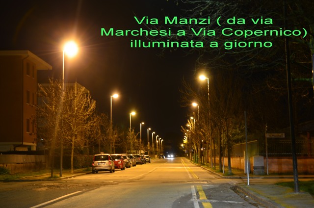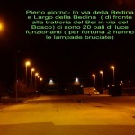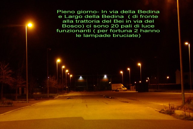 Ci sono strade illuminate a giorno ( più degli stadi Masini e Buti ) senza che vi siano abitazioni adiacenti. Non importa andare molto lontani dal centro storico basta portarsi in via Manzi, strada che inizia da Via Copernico e finisce in via Marchesi; via Meucci, Via della Bedina. Via Caduti sul Lavoro etc etc.. Ad illuminare a giorno Via Manzi ormai da mesi e mesi ci sono pali di illuminazione ubicati su tutte e due i lati della strada e alcuni anche nel centro del marciapiede che ostacolano il passaggio delle carrozzine dei bambini e degli handicappati. Altra località illuminata a giorno è la piazza attigua a via della Bedina quella di fronte al ristorante “Bei” in via del Bosco oppure il Largo adiacente alla via dei Caduti sul Lavoro. Lì veramente uno ci potrebbe far disputare in notturna un torneo di partite di calcio altro che allo stadio Masini!!!