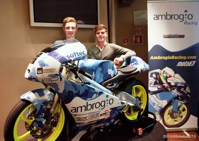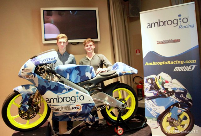 Confermato il pilota Brad Binder, diciottenne sudafricano che ben si è comportato lo scorso anno in Moto 3, che sarà affiancato da un’altra giovane speranza: il francese Jules Danilo, che aveva sostituito quest’estate per due gare l’infortunato Danny Webb e che ora diventa titolare. Alla presentazione hanno partecipato anche all’Ingegner Alessandro Giussani, progettista della Mahindra con cui il Team partecipa al motomondiale e Jordy manzoni, ex pilota di cross e ora coach del Team Ambrogio, oltre a tutti gli sponsor della squadra.