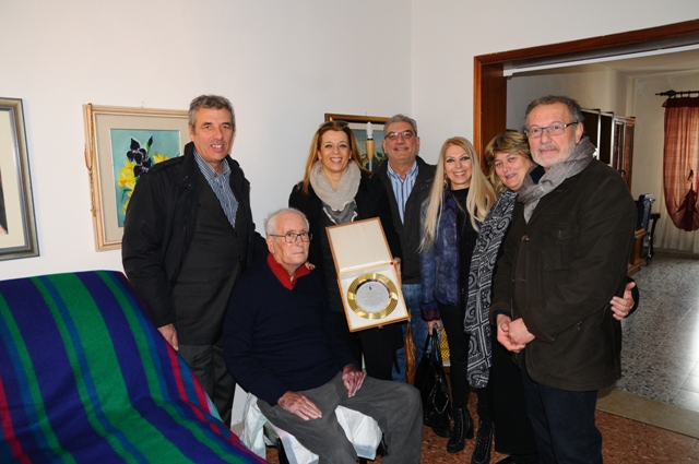 Il sindaco Ilaria Parrella, la vicesindaco Del Grande, gli assessori Michi, Maccanti e Lucchesi e il consigliere Pedone consegnano a Alberto Ristori la targa che gli assegna il titolo di presidente onorario del Comitato Gemellaggi di Santa Maria a Monte