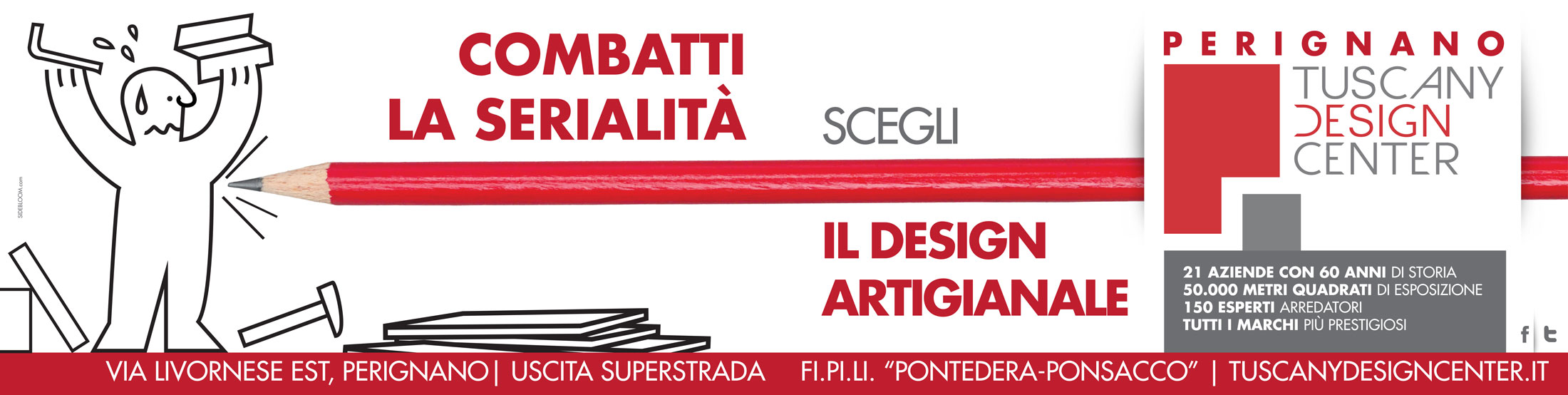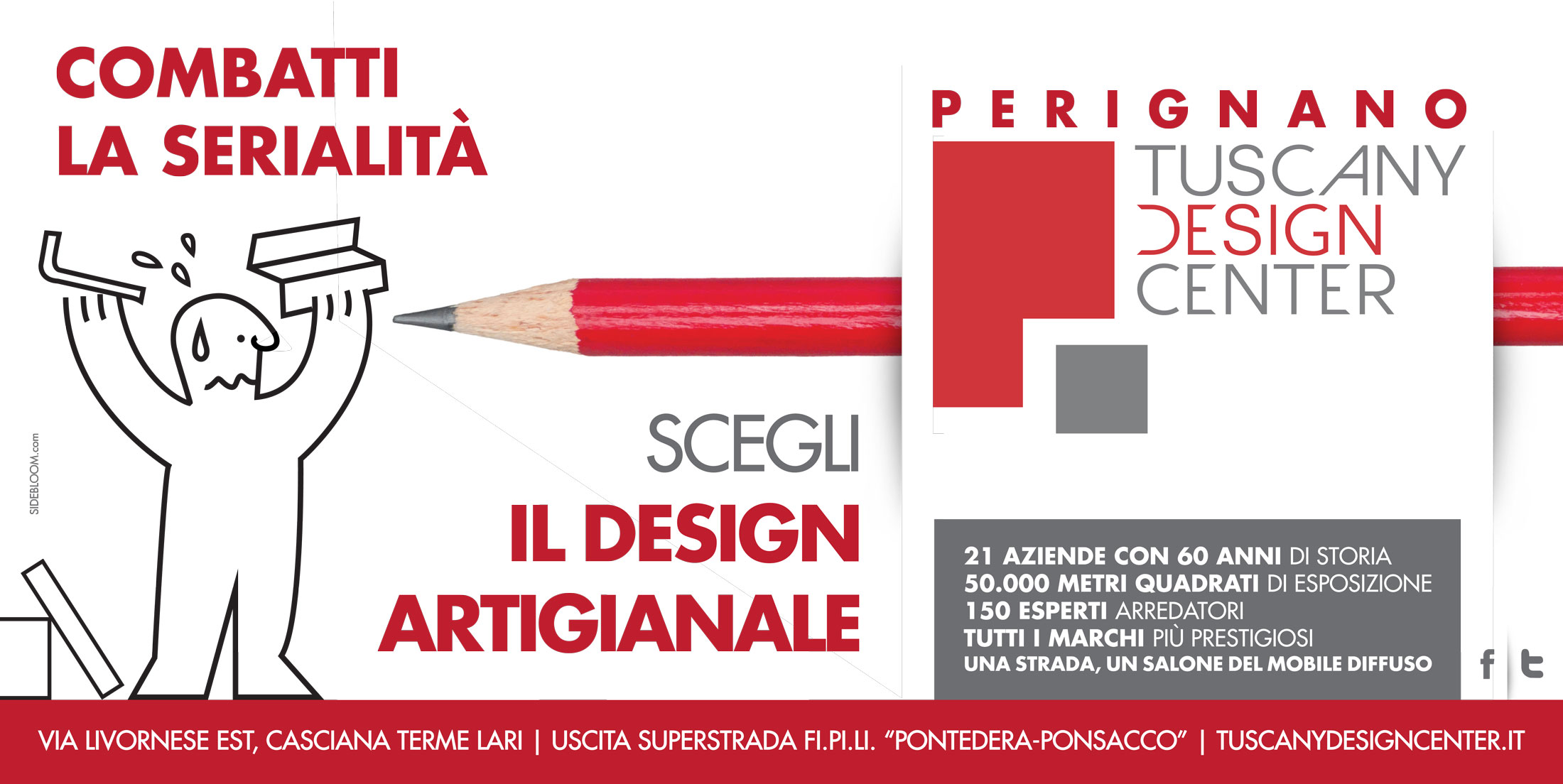 Il riferimento al colosso Ikea è esplicito: l’omino infatti è il tuttofare che compare sulle istruzioni per l’uso della multinazionale svedese e si arrende di fronte alla sapienza, esperienza e tradizione del design artigianale proposto dal Tuscany Design Center che riunisce 20 aziende, con 60 anni di storia in 50 mila metriquadrati di esposizione dove è possibile approfittare della consulenza di esperti arredatori e tecnici e trovare tutti i grandi marchi del design. È una scelta affermata in modo forte e chiaro, con orgoglio, sulla prima uscita pubblicitaria del Tuscany Design Center di Perignano, l’associazione nata nel novembre 2013 tra importanti aziende del settore dell’arredamento, come reazione viva e sinergica alla crisi che ha colpito anche il settore del mobile. Un settore, quello di Perignano, che è sano, ricco di eccellenze riconosciute anche all'estero e che vuole fare della crisi un’opportunità di cambiamento, innovazione e crescita, all'insegna della qualità tutta italiana.