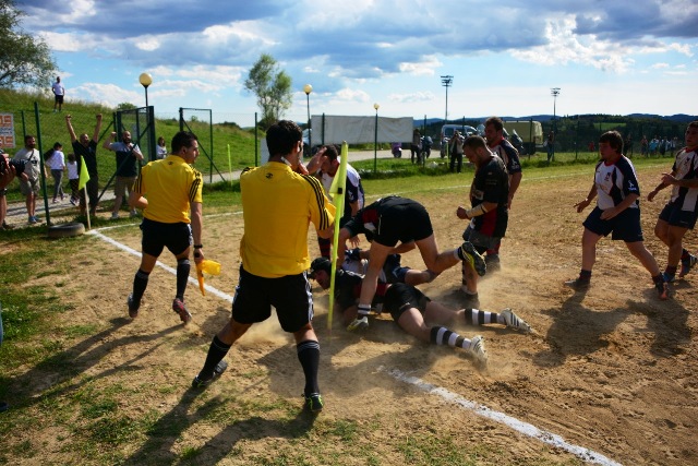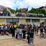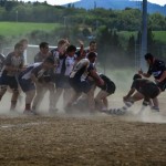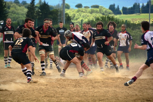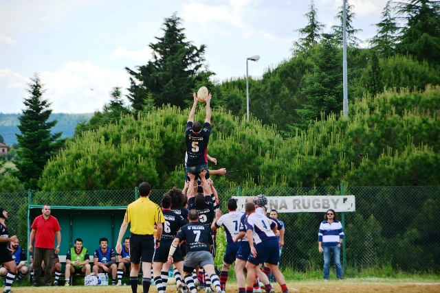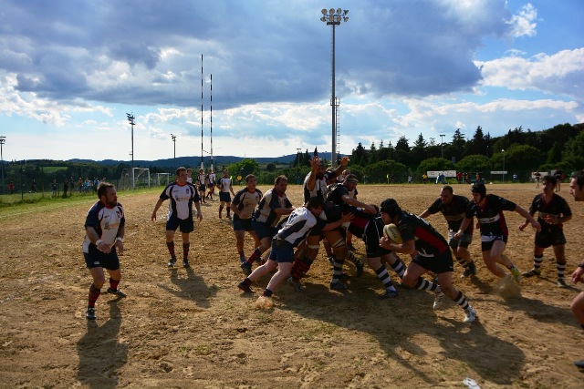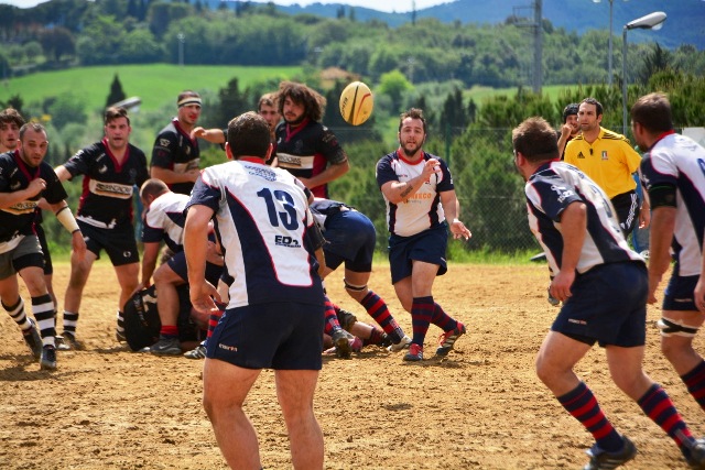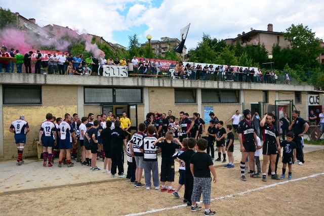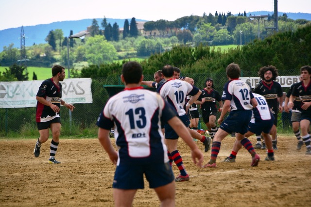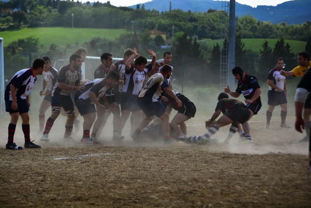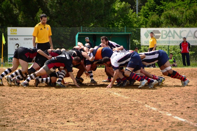 La ripresa inizia con Siena che, ancora in inferiorità numerica, occupa bene il campo e allunga di nuovo con l’implacabile Mondet (15-7, al fischio finale sarà un sontuoso 7/9). Ma il soffio di respiro dei senesi dura un attimo. All’8’ il potente Rossi fora al centro la difesa bianconera e produce una profonda ferita nella retroguardia: l’assalto, faticosamente bloccato, prosegue dopo un calcio di punizione fischiato a vantaggio degli umbri: così, con un’azione identica a quella che è valsa la prima segnatura, Grassellini viola per la seconda volta la meta senese (15-14). Ora, per la prima volta, sono gli eugubini a vedere il traguardo della finale. Siena si disunisce un po’: Marzi, marcato con attenzione, perde la supremazia in touche, le terze linee umbre fanno sentire il loro peso nelle percussioni, qualche giocata un po’ estemporanea toglie sicurezza al gruppo. Siena soffre, dunque, ma lotta. Riguadagna la finale al 21’ (18-14, piazzato di Mondet), la perde al 30’ (18-17, piazzato di Romano), la riagguanta al 37’ (21-17, piazzato di Mondet) in pazzo susseguirsi di capovolgimenti di fronte. Ogni pallone può essere quello decisivo: una giocata geniale, un qualsiasi errore, può rivelarsi decisivo e spedire una delle due contendenti al paradiso della finale e cacciare l’altra nel purgatorio dei rimpianti. Le due compagini lottano accanitamente (e correttamente, occorre aggiungere). Intorno i senesi corrono due brividi. Prima i tre quarti umbri commettono uno sciagurato in avanti in una fase di gioco fondamentale (cinque contro tre); un attimo dopo Romano mette a lato una punizione da grande distanza. Scampato il pericolo, trascinato dal pubblico, Siena chiude in attacco. Le ultime fasi sono ancora più emozionanti. La pressione senese si fa sentire: una meta viene annullata per passaggio in avanti, due lanci in zona di attacco non sono coronati da successo per un niente: infine, il possente Carmignani trova un piccolo varco nei pressi della bandierina e consacra la vittoria dei bianconeri (26-17). Grande, ovviamente, la gioia del pubblico e dello staff dirigente senese che tocca con mano la bontà del proprio lavoro. Per la seconda volta in tre anni (nel 2010 Banca Cras cadde negli ultimi istanti di gioco della semifinale) la squadra conquista la finale per la promozione. Domenica prossima match di andata al Sabbione. Onore, com’è giusto che sia, al valoroso, tenace e leale Gubbio.