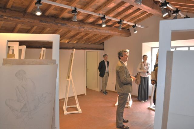 Anche nel locale posto al piano primo, che verrà adibito ad aula per il disegno dal vero, le capriate sono state lasciate a vista, sono stati ripresi gli intonaci e eseguita la tinteggiatura. Qui è stato completamente rifatto l’impianto elettrico e sono stati montati dei fari spot di tipo a led. Ogni singolo faretto può essere direzionato a piacimento modo da creare gli effetti di luce e ombra necessari per l’attività di disegno e pittura.