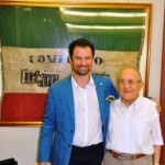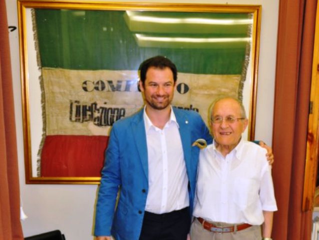 - Il sindaco Alessio Falorni insieme a Mario Cioni (Sindaco di Castelfiorentino dal 1951 al 1975) e – dietro – la bandiera del Comitato di Liberazione Nazionale, in cui militò il nonno di Alessio – Libero Falorni – autore peraltro del volume: “La memoria della libertà. Il movimento partigiano in Valdelsa”