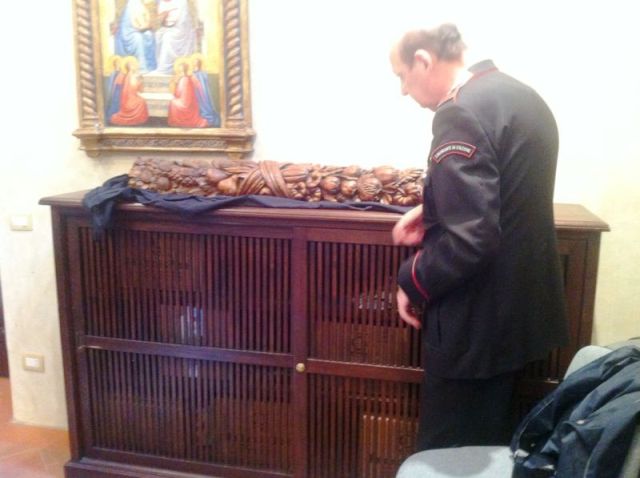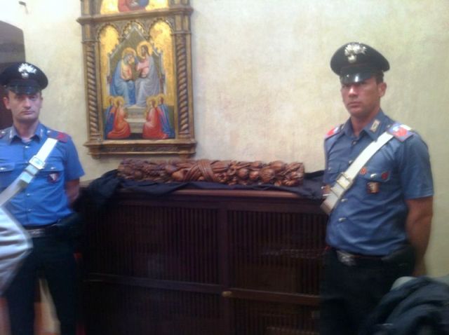 I carabinieri di Firenze hanno ritrovato la formella rubata dalla porta centrale della basilica di Santa Croce a Firenze il cui furto era stato scoperto ieri. La formella, di legno e con una decorazione floreale intagliata, è stata ritrovata in via San Giuseppe, durante i servizi di ricerca avviati dai militari, appoggiata alla cancellata del museo della stessa basilica ed avvolta in un panno nero.