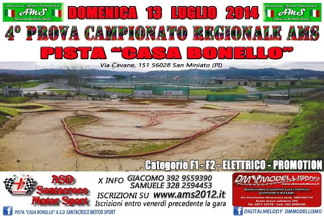 Grande attesa per la 4° prova del campionatoi regionale AMS con gli automodellini categorie F1 - F2 elettrico e promotion, che si svolgerà domenica 13 luglio 2014 dalle ore 08,30 presso la pista dedicata degli impianti di Casa Bonello in località La Catena di San Miniato (PI) in Via Cavane, 151.