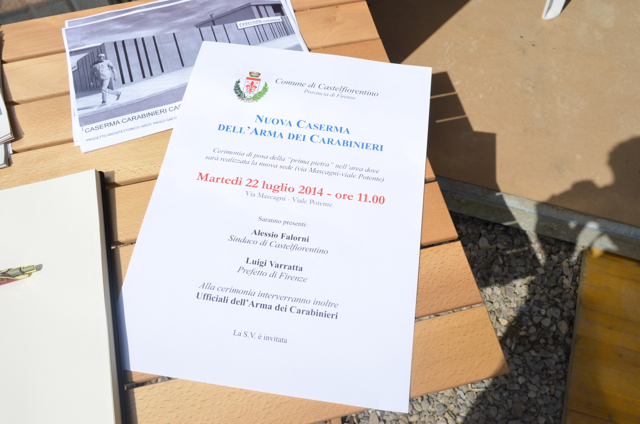 Si è tenuta stamani, all’incrocio tra Via Mascagni e Viale Potente, la cerimonia di “posa della prima pietra” della futura Caserma dei Carabinieri di Castelfiorentino, la cui realizzazione è prevista per la fine del 2015. Presenti, a sottolinearne la significativa portata, il Prefetto di Firenze, Luigi Varratta e rappresentanti dell’Arma dei Carabinieri, fra cui il Comandante Provinciale, Colonnello Andrea Taurelli Salimbeni, il Comandante della Compagnia Carabinieri di Empoli, Capitano Giuseppe Pontillo e il Maresciallo Superiore Roberto Rocco della locale stazione. Un vero e proprio esempio di progetto partecipato che posa le sue radici in un percorso lungo e tortuoso, dai tempi di Laura Cantini fino a passare al passato più recente con Il sindaco Giovanni Occhipinti.