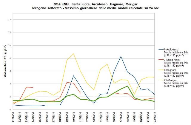Già dal mese di settembre si sono avute situazioni che hanno comportato lo sfioro in atmosfera di fluidi geotermici, gli effetti sulla qualità dell'aria sono stati limitati. I seguenti grafici riportano la media mobile sulle 24 ore della concentrazione di H2S nelle prime tre settimane di settembre.