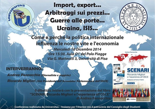 Tutti i giorni sentiamo parlare di politica estera ( ultimamente di Isis e crisi ucraina in particolare). A me e agli altri ragazzi della lista "Universitas insieme per l'Ateneo" é venuta voglia di capire quanto questi fatti internazionali influiscano sulla politica nazionale. Pertanto abbiamo chiamato l'Onorevole Migliori( professore alla Luiss Guido Carli) per parlare a noi e a tutti quanti vorranno a venire della sua esperienza all'Osce e dei principali fatti di attualità della politica estera . Il dibattito si terrà mercoledì 10 dicembre alle ore 15 e 30 nell'Aula O1 del Polo Piagge ( Via Matteotti 3). Interverrà , oltre a Migliori, lo scrittore Andrea Pannocchia, autore di alcune pubblicazioni sulla politica estera.