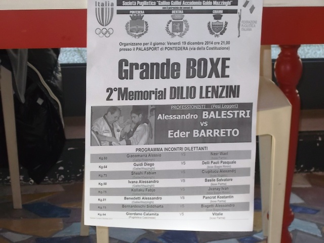 La grande boxe è di casa a Pontedera, ma l'appuntamento di domani potrebbe essere l'inizio di un cammino stellare per un nuovo 'campioncino' Per il 2° memorial Dilio Lenzini, arbitro internazionale scomparso nel 2013, l'Accademia pugilistica 'Galileo Galilei-Guido Mazzinghi' ha messo in campo l'incontro tra Alessandro Balestri, 25enne promessa nato a Pisa ma con il cuore pontederese, ed Eder Barreto, per la categoria pesi leggeri. La conferenza stampa tenuta oggi, giovedì 18 dicembre, al caffè La Cittadella di Pontedera, alla presenza dell'assessore allo sport Matteo Franconi e del presidente dell'Accademia Fabiano Angelini, è stata tenuta proprio per dare risalto a questa manifestazione, in uno sport spesso tenuto nascosto.