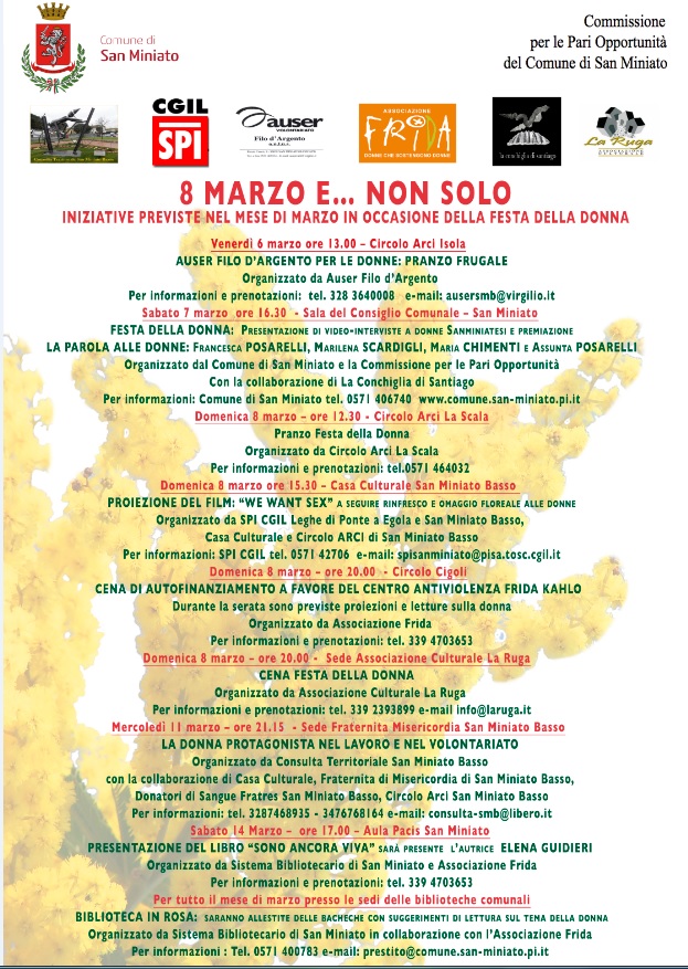 Per l'8 marzo ci saranno ben 4 iniziative: il pranzo a tema al circolo Arci di La Scala, la proiezione del film We want sex alla casa culturale di San Miniato Basso, la cena di autofinanziamento del centro antiviolenza Frida Kahlo di San Miniato Basso e quella a Ponte a Egola tenuta dall'associazione La Ruga.