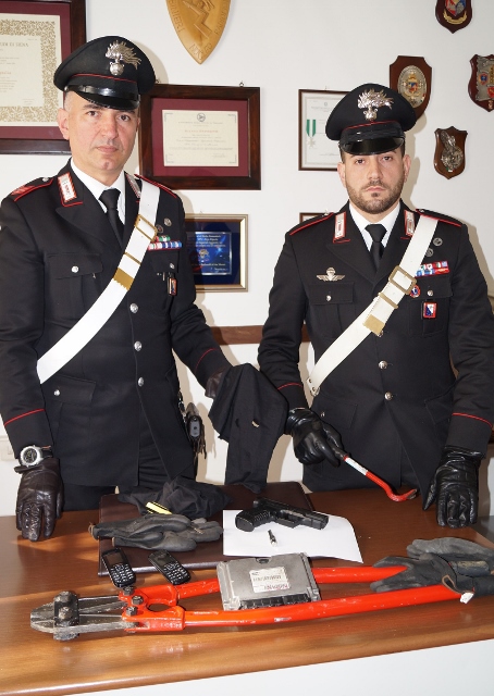 Prontamente bloccati e immobilizzati dai Carabinieri si sono arresi senza opporre resistenza. A bordo del mezzo rubato, una Fiat Panda, veniva recuperato altro materiale atto allo scasso e una particolare centralina utile all’avviamento senza le relative chiavi di alcuni tipi di autovetture. A bordo dell’auto “pulita”, una Peugeot 307, veniva recuperato altro materiale di interesse, tra cui l’abbigliamento e gli strumenti precedentemente adoperati per il danneggiamento delle inferriate poste a protezione degli infissi.