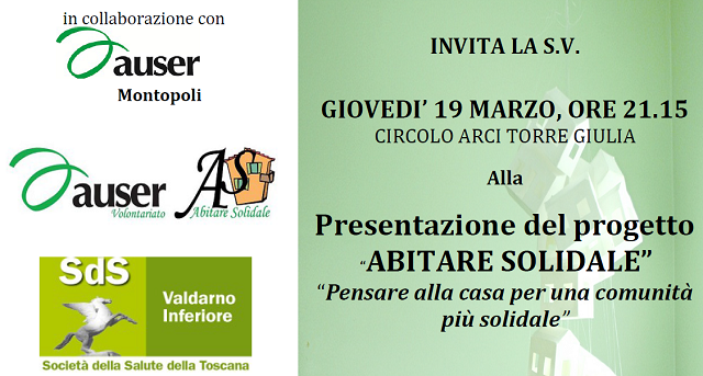 Giovedì 19 marzo ore 21.15 presso il Circolo Arci Torre Giulia all’iniziativa organizzata dal Vice Sindaco Linda Vanni, in collaborazione con Auser Montopoli e Società della Salute Valdarno, sarà presentato il progetto Abitare Solidale. Il progetto nasce dall’idea di trasformare il “problema abitativo” in nuove opportunità per la costruzione di una comunità più coesa e solidale.