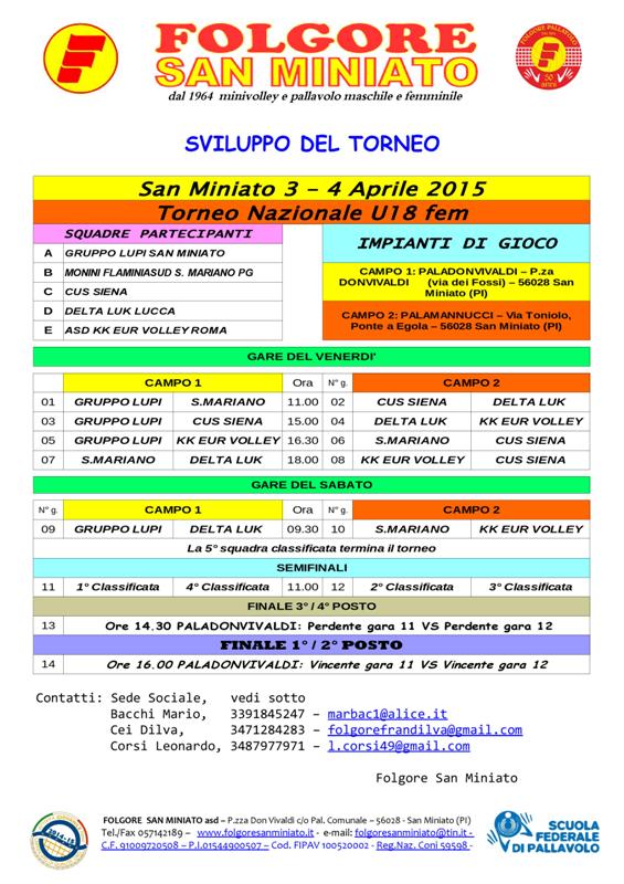 Adesso nel periodo pasquale verrà organizzata la Coppa Giada Veracini (Under 18 Femminile) ed a Settembre il Trofeo Francesco Stacchini per squadre giovanili maschili. Dividendo i due impegni organizzativi, ogni anno sempre più difficili se si vuol restare a livello nazionale, riteniamo di poter offrire un servizio migliore a squadre ed atleti e speriamo che la scelta sia la migliore sotto il profilo organizzativo e di prestigio dei tornei. In allegato il calendario del torneo femminile del 3 e 4 Aprile
