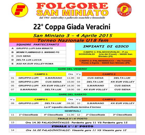 Per la 22^ edizione della Coppa Giada Veracini sono già usciti i programmi del torneo U18 femminile. A contendersi il trofeo il Gruppo Lupi di San Miniato, il Cus di Siena, il Delta Luk di Lucca e due squadre non toscane: il Monini Flaminiasud di San Mariano (Perugia) e l'Asd Kk Eur Volley di Roma.