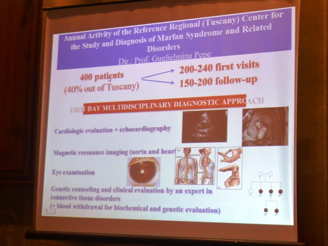 Guglielmina Pepe, professore associato di Patologia Clinica, Dipartimento di Medicina Sperimentale e Clinica dell’Università di Firenze, è la referente del Centro di Riferimento Regionale Toscano per la sindrome di Marfan, e in conferenza stampa ha spiegato alcune caratteristiche della patologia: «E’ una malattia  ereditaria  del tessuto connettivo che coinvolge principalmente il cuore ed i vasi sanguigni (sistema cardiovascolare), le ossa ed i legamenti (sistema scheletrico), gli occhi (sistema oculare) ed i polmoni. Al nostro centro, il primo in Italia ad essere riconosciuto, si rivolgono circa 400 persone ogni anno, di cui il 40% da fuori regione.