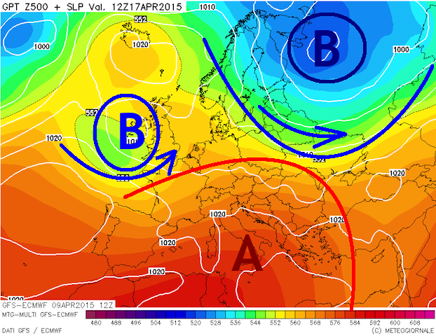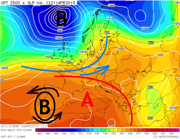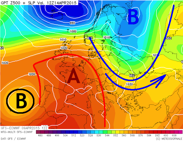 Iniziamo con l'analisi a breve termine, ove un campo di alta pressione di matrice oceanica, si arricchirà nei giorni a venire della componente afro-mediterranea. Tale apporto è sempre frutto di una spinta barica, provocata da un nucleo di bassa pressione, spesso nemmeno troppo profondo, che incuneandosi tra le coste del Portogallo e lo Stretto di Gibilterra nel suo moviemnto antiorario, favorisce la risalita delle calde correnti africane.