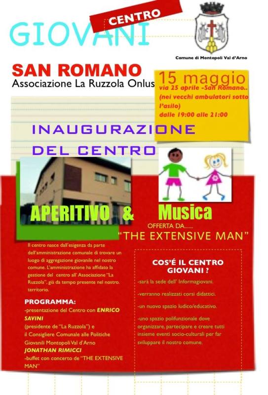Il Comune di Montopoli è arrivato alla fase conclusiva del progetto 'Centro giovani': venerdì 15 maggio sarà inaugurato a San Romano il centro nei vecchi ambulatori sotto l'asilo di via XXV Aprile.