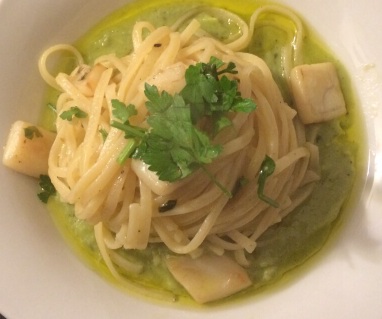 Come ultimo step cuocete la pasta in abbondante acqua salata e 3 minuti prima del suo tempo di cottura, ultimatela nella padella con le seppie a fuoco alto, irrorandola con l’acqua di pasta e saltando il tutto, come si farebbe per un risotto: ciò agevolerà l’amalgama a causa dell’amido rilasciato dalla pasta, é un metodo utilizzato anche in altre preparazioni. Impiattate: vellutata come base del piatto, poi le linguine con seppie sopra, prezzemolo tritato ed un eventuale goccio di buon olio a crudo.