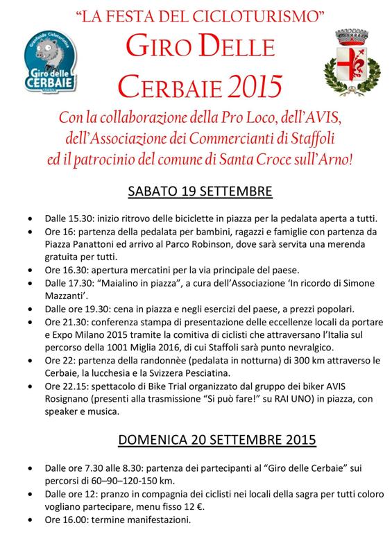 Con il patrocinio dei comuni di Santa Croce e Santa Maria a monte, l’ASD Giro delle Cerbaie in collaborazione con la Pro Loco, l’Avis e l’Associazione Commercianti organizza la prima edizione della Festa del Cicloturismo nelle giornate di Sabato 19 e Domenica 20 Settembre.