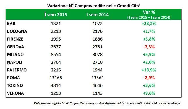 L’Ufficio Studi del Gruppo Tecnocasa, sulla base dei dati forniti dall’Agenzia delle Entrate, ha analizzato l’andamento delle compravendite nelle grandi città italiane nel primo semestre del 2015.