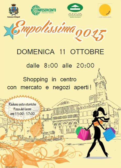 Domenica 11 ottobre Empoli ospiterà la Fiera Promozionale “Empolissima 2015”, dalle 8 alle 20 lungo le vie del centro saranno presenti oltre 130 banchi di operatori su area pubblica, inoltre i negozi rimarranno aperti trasformando il centro in una grande area pedonale a disposizione di visitatori e curiosi. “Empolissima” è, ormai, un appuntamento fisso dell’inizio autunno empolese, per quest’edizione è attesa una presenza notevole di visitatori.