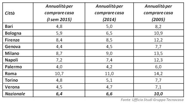 L’acquisto della casa è una delle spese maggiori che le famiglie italiane devono sostenere. A livello nazionale si evince che adesso sono necessarie 6,4 annualità di stipendio per comprare casa, in leggera diminuzione con quanto rilevato nel 2014 (6,6 annualità). Anche a livello locale non ci sono state variazioni di rilievo: con un calo pari a -0,6 annualità fa eccezione Bologna (dove ne servono 5,9), mentre Milano, Roma e Torino vedono una diminuzione di 0,3 annualità. La Capitale è sempre la città in cui serve il maggior numero di annualità: con 10,7 stacca Milano, ferma a 8,7 annualità, e Firenze (8,4). A Palermo e Genova ne servono meno: 4 nel capoluogo siciliano e 4,4 nella città della Lanterna.