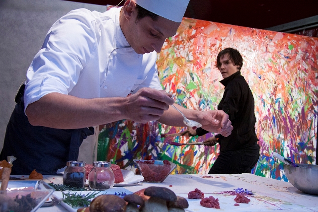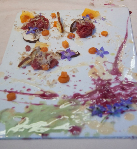 Simone ha proposto una “Tartare, autunno e tartufo” che ha deliziato e sorpreso i palati, Cinzia ha realizzato una tela di cm 230x200 piena di colori, suggestioni e emozioni catturate direttamente dal piatto di Simone.