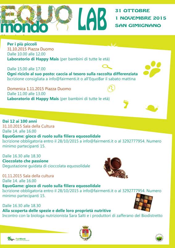 Tante le novità per il 2015, come i laboratori per grandi e piccini su diversi temi legati al mondo della sostenibilità ambientale e del commercio equo e solidale nella Sala della Cultura, i giochi in piazza, e le degustazioni agli stand (in allegato il volantino con il programma della due giorni).