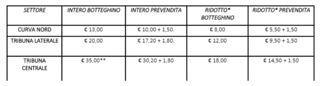 Sarà possibile acquistare i biglietti per la partita in oggetto nelle seguenti modalità (muniti di documento d’identità valido, vale a dire Carta d’Identità o Patente di Guida):