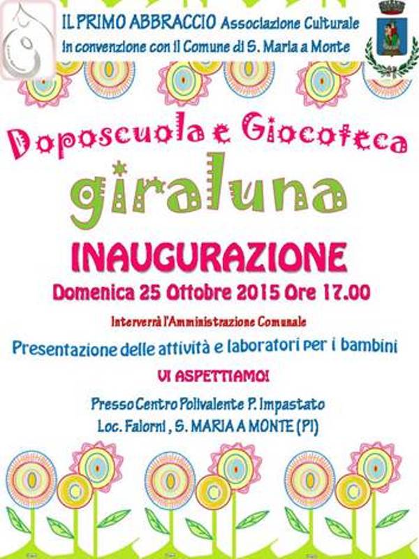 Il Primo Abbraccioè lieto di invitarvi alla inaugurazione dello spazio Doposcuola e Giocoteca "Giraluna" Domenica 25 Ottobre alle ore 17,00 presso il centro polivalente P.Impastato Loc. Falorni a Santa Maria a Monte (PI).