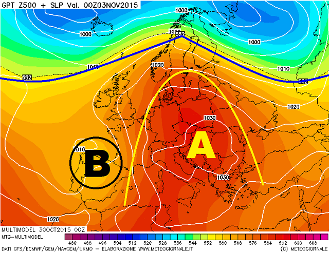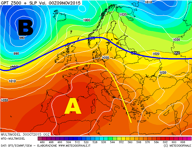 In una situazione di blocco anticiclonico come quella stiamo per vivere, scomodiamo eccezionalmente una mappa a lungo termine (circa 300 ore) con tutte le incertezze del caso. Ebbene, a partire dal 12-13 novembre, l'intero quadro parrebbe del tutto smantellato, grazie ad una prima irruzione nord-atlantica da nord-ovest che punterebbe verso di noi, mentre ad est, aria più fredda ed instabile , stringerebbe a tenaglia il tenace anticiclone, costringendolo a dividersi, e a risalire verso la penisola scandinava.