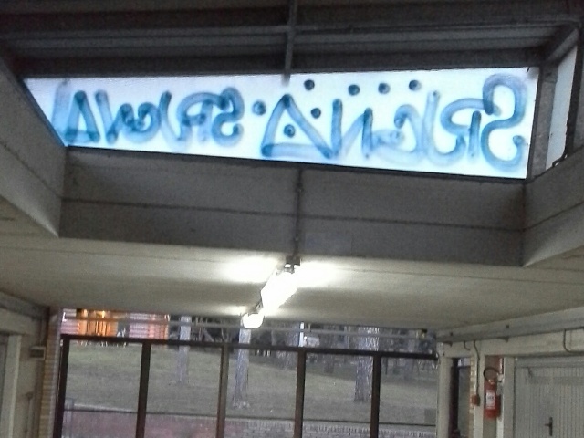 I vandali (che presumo siano giovani che non hanno nulla da fare dalla mattina alla sera, mentre la gente normale lavora) sono persino saliti sul tetto e hanno dipintio scritte sui vetri del Condominio. Purtroppo questa gente è furba e raramente si fanno trovare, altrimenti avrei già chiamato vigili e carabinieri se li avessi notati. Ho fatto delle foto che Vi allego, per farVi vedere in che condizioni è ridotto il nostro condominio, senza contare gli oblò dei garage spaccati con le mazze o rotti tirando sassate (al mio non ci sono ancora arrivati perchè è lontano ed in alto, ma quelli bassi sono stati quasi tutti spaccati, tanto è, che i proprietari sono stati costretti a metterci delle lamiere al posto dell'oblò per proteggersi da questi vandali).
