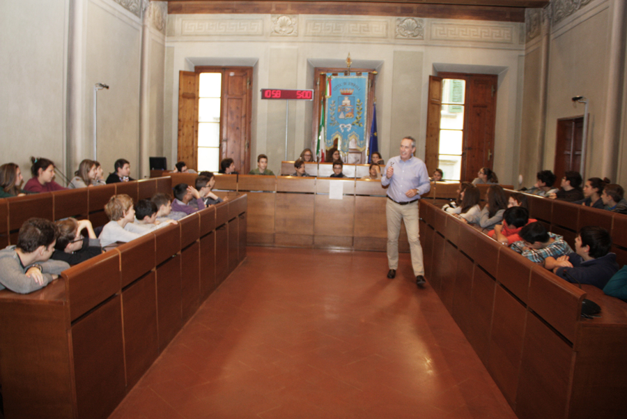 E’ stato il presidente del Consiglio Comunale di Empoli Roberto Bagnoli a fare il padrone di casa e a illustrare ad alunne ed alunni, seduti su tutti gli scranni, il ruolo, i meccanismi e alcuni ‘segreti’ di questa basilare istituzione della Città di Empoli.