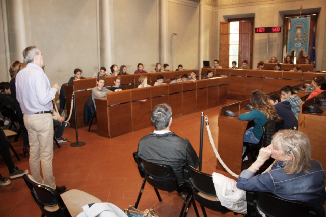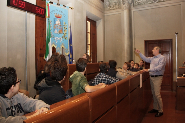 E’ stato il presidente del Consiglio Comunale di Empoli Roberto Bagnoli a fare il padrone di casa e a illustrare ad alunne ed alunni, seduti su tutti gli scranni, il ruolo, i meccanismi e alcuni ‘segreti’ di questa basilare istituzione della Città di Empoli.