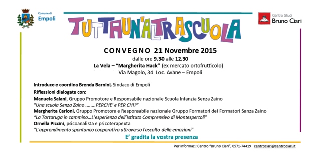 «Sarà un’occasione importante per confrontarci con i genitori, le insegnanti e i pedagogisti sul progetto ‘senza zaino’ – spiega il sindaco di Empoli Brenda Barnini – che da quest’anno è stato avviato in due scuole primarie della città, ad Avane e Cortenuova. Abbiamo sempre più bisogno di una scuola basata sulla responsabilità, la partecipazione e la condivisione, che promuova le competenze e la centralità del bambino. Innovare i modelli educativi recuperando i capisaldi della pedagogia è l’obiettivo che ci proponiamo di cogliere con la scuola ‘senza zaino’. Fondamentale in questo percorso è il pieno coinvolgimento delle famiglie e degli operatori per dare vita, tutti insieme a “Tutta un’altra scuola”».