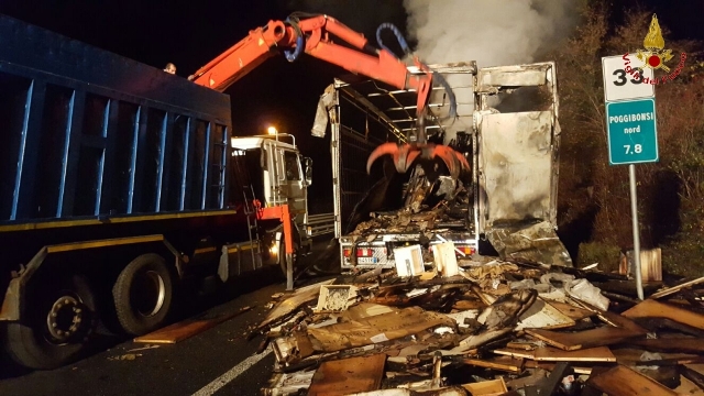 Il camion telonato stava trasporando mobili. Al momento il traffico è deviato sulla strada statale 2 ‘Cassia’ con uscita obbligatoria a San Donato al km 35+700 e rientro al km 25+000 Poggibonsi nord. Sul posto sono presenti le squadre di pronto intervento Anas e dei vigili del Fuoco per le operazioni di spegnimento e per ripristinare la regolare circolazione nel più breve tempo possibile.