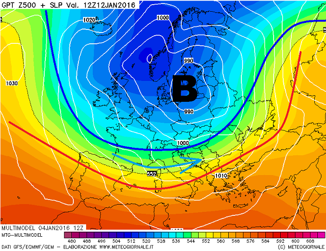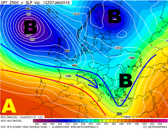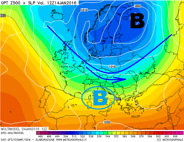 Chiusura dello step previsionale molto incerta ma che deporrebbe ad un ritorno del maltempo, con un piccolo nucleo barico in formazione sulla nostra penisola, grazie allo scontro tra le masse più fredde in discesa da Nord-Ovest, in scorrimento laterale, a quel nucleo depressionario ormai confinato nella Russia Settentrionale, ed il mite richiamo anticiclonico adagiato sulle regioni meridionali della penisola. Si tratta comunque di un'ipotesi davvero particolare e che dovrà essere suffragata da altre emissioni modellistiche in futuro.