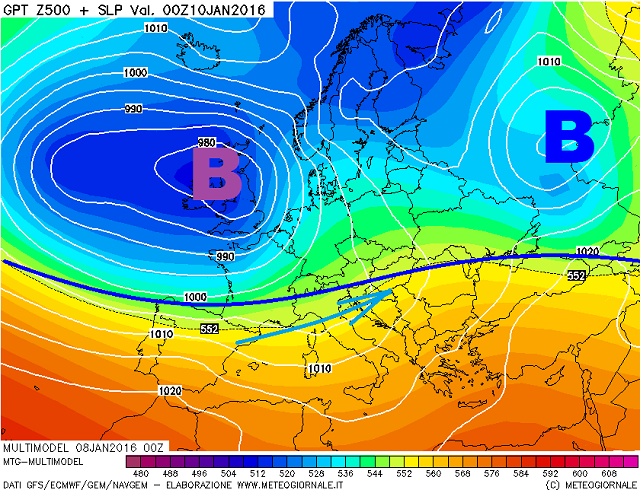 Scendiamo quindi nell'analisi approfondita con una mappa che ci presenta l'ormai imminente fine settimana, con l'influenza di altre perturbazioni atlantiche la prima delle quali, irromperà già dalla tarda serata di oggi, guastando il tempo per l'intera giornata di domani e riportando le piogge purtroppo anche in Appennino, visto il rialzo termico in quota, generato dall'inserimento di aria più mite richiamata dal centro-sud della penisola.