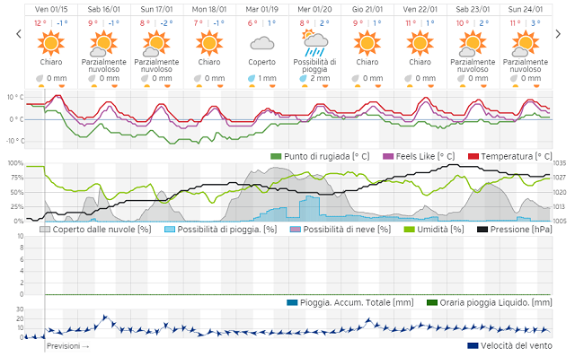 Come ci dimostrano la previsioni generate dalla nostra stazione meteo, le temperature minime non scenderanno mai sotto valori importanti, e con molta probabilità la nostra zona non vedrà nemmeno inizialmente i deboli fenomeni nevosi previsti tra la serata di martedì e la mattinata di mercoledì, complice la posizione orografica del territorio, aperto verso il mare e quindi più esposto a tutti i richiami termici, compresi quelli miti.