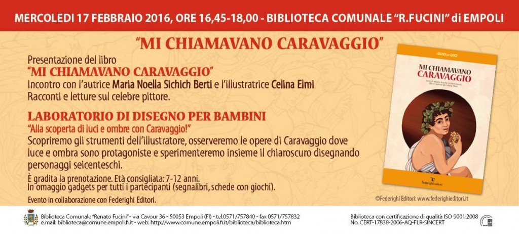Mercoledì 17 febbraio presentazione del libro “Mi chiamavano Caravaggio” (Federighi Editori) e incontro con l’autrice Maria Noella Sichich Berti e l’illustratrice Celina Elmi. Letture, racconti e curiosità sul grande pittore. Come nasce un libro illustrato? Dall’idea alla stampa. Laboratorio di disegno: “Alla scoperta di luci e ombre con Caravaggio!”. Scopriremo con l’illustratrice Celina gli strumenti dell’illustratore, osserveremo le opere di Caravaggio, sperimenteremo insieme il chiaroscuro disegnando personaggi seicenteschi. Dalle 16.45 alle 18, per bambini da 7 a 12 anni, su prenotazione.
