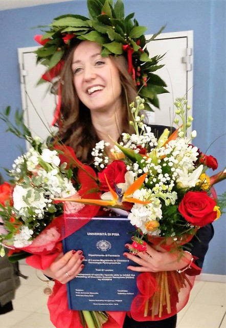 La neodottoressa ha discusso una tesi dal titolo: “Development of specific ligands able to inhibit the shedding of Discoidin Domain Receptors (DDRs) by ADAM10”, con relatori il Professor Armando Rossello e la Dottoressa Elisa Nuti, ottenendo il punteggio di 110/110 e LODE.
