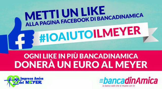 Bancadinamica non è nuova a queste iniziative: dopo il #DinamicaTour del 2014 che ha diffuso per tutta la Toscana il messaggio solidale #sbancalabancaperilMeyer insieme al mitico cicloturista del web Gabriele Saluci, oggi rilancia il suo sostegno alla Fondazione Meyer oltre che con una donazione anche con un’operazione social volta a sensibilizzare sempre di più il pubblico verso l’ente toscano: 1 LIKE = 1 Euro in più in dono alla Fondazione!