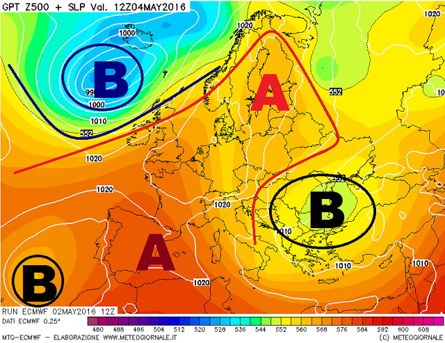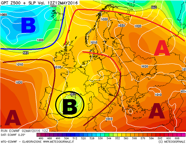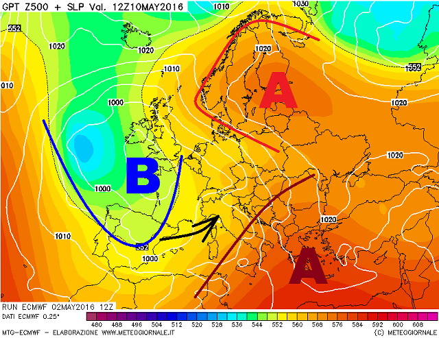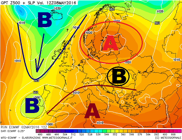 Il motivo della perdurante fase instabile andrà ricercato nella fusione sull'Est Europeo dell'anticiclone Russo unito a quello afro-mediterraneo, chiudendo così ogni via d'uscita a quel che resta del nucleo depressionario in seno al Mediterraneo. Decisivo poi per la successiva cessazione dell'instabilità sarà anche l'anticiclone delle Azzorre, che finchè non risalirà di latitudine chiudendo "l'alimentazione" del flusso atlantico al residuale minimo barico presente sulla Spagna, ci troveremo a vivere forse l'intera settimana in un contesto variabile, certo non perturbato ma instabile.